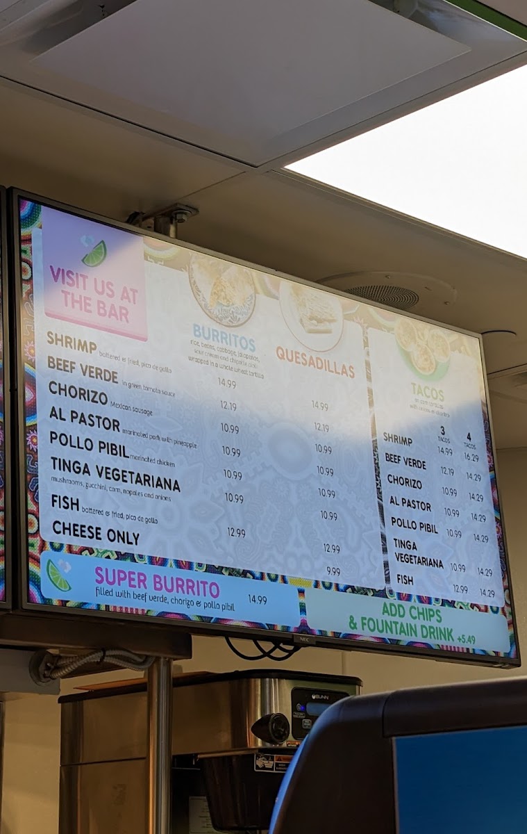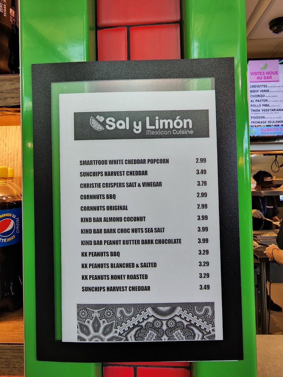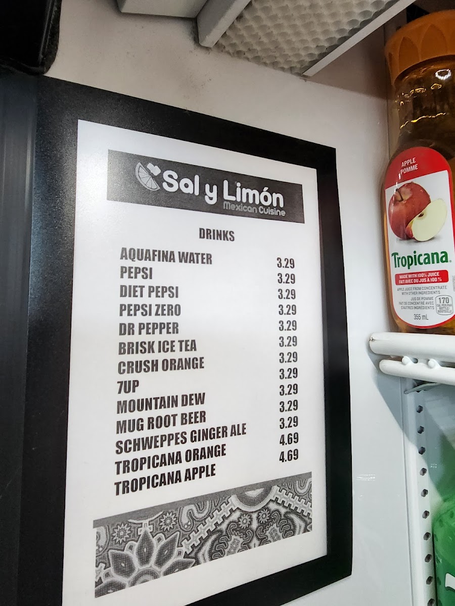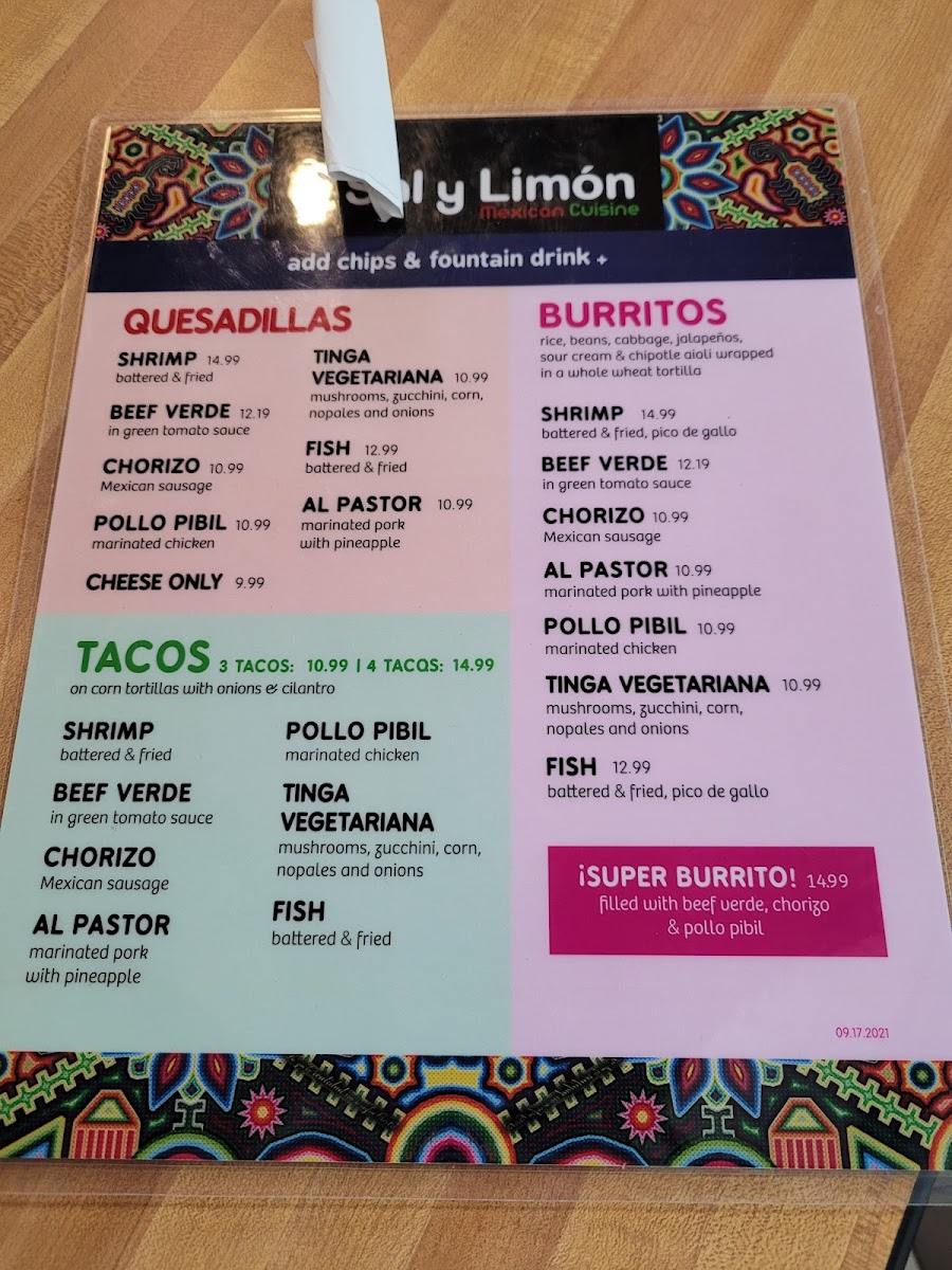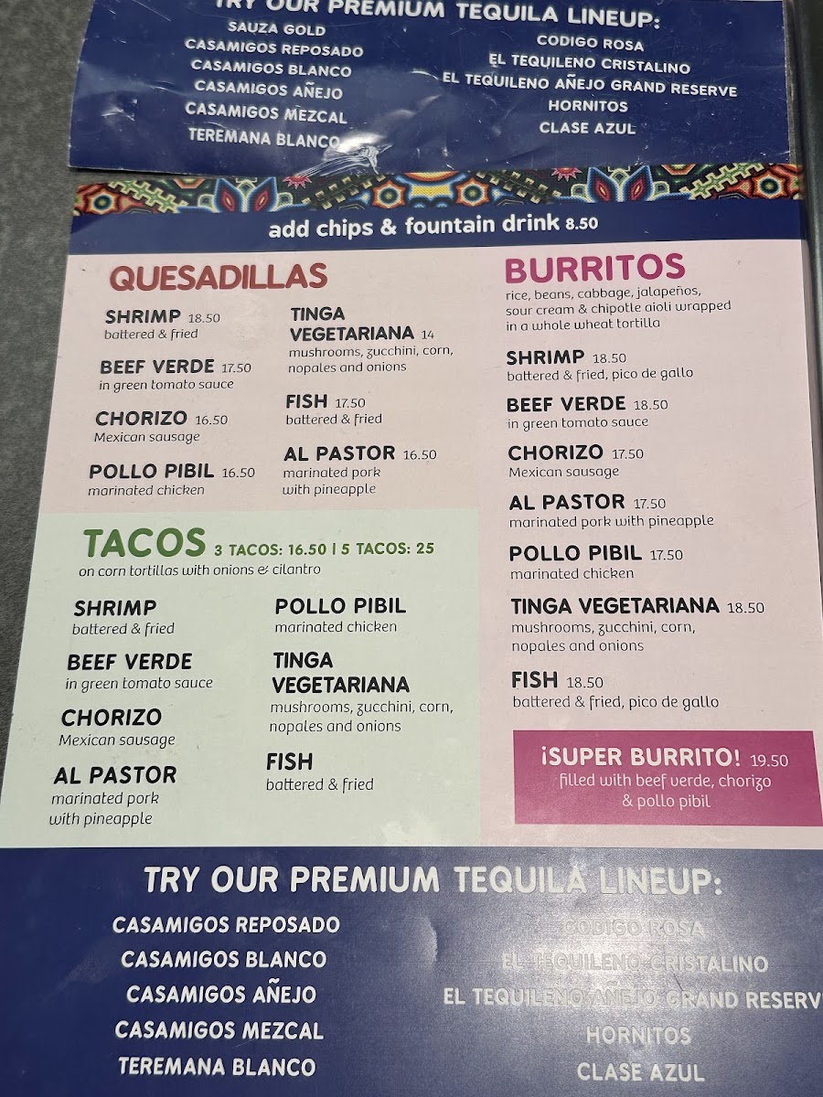 The menu at Sal Y Limón offers a vibrant selection of Mexican-inspired dishes, perfect for any craving. For those looking to hydrate, they offer a variety of drinks including Aquafina Water, Pepsi, Diet Pepsi, Pepsi Zero, and Dr. Pepper. For those with a taste for tequila, the Premium Tequila Lineup features options such as Sauza Gold, Casamigos Reposado, Casamigos Blanco, Casamigos Añejo, and Casamigos Mezcal. The Quesadillas are a hit, with choices like Shrimp, Beef Verde, Chorizo, Pollo Pibil, and Tinga Vegetariana. Burrito lovers will appreciate the variety, including Shrimp, Beef Verde, Chorizo, Al Pastor, and Pollo Pibil options. The Breakfast Burritos offer delicious combinations such as El Super Chido, El Luchador, El Gringo, El Mañanero, and La Catrina. For tacos, there’s something for everyone, from Shrimp and Beef Verde to Al Pastor, Pollo Pibil, and the Tinga Vegetariana. Other delightful options include Cheese Only, Tinga, and Vegetariana. Overall, the menu provides a diverse and flavorful experience, offering a range of dishes to suit any preference.